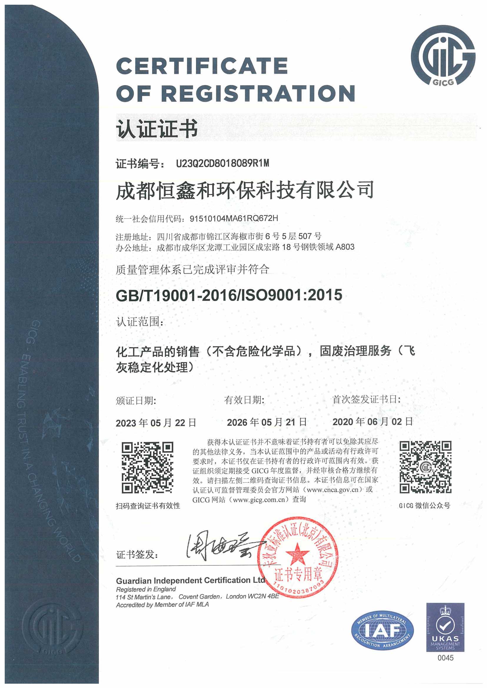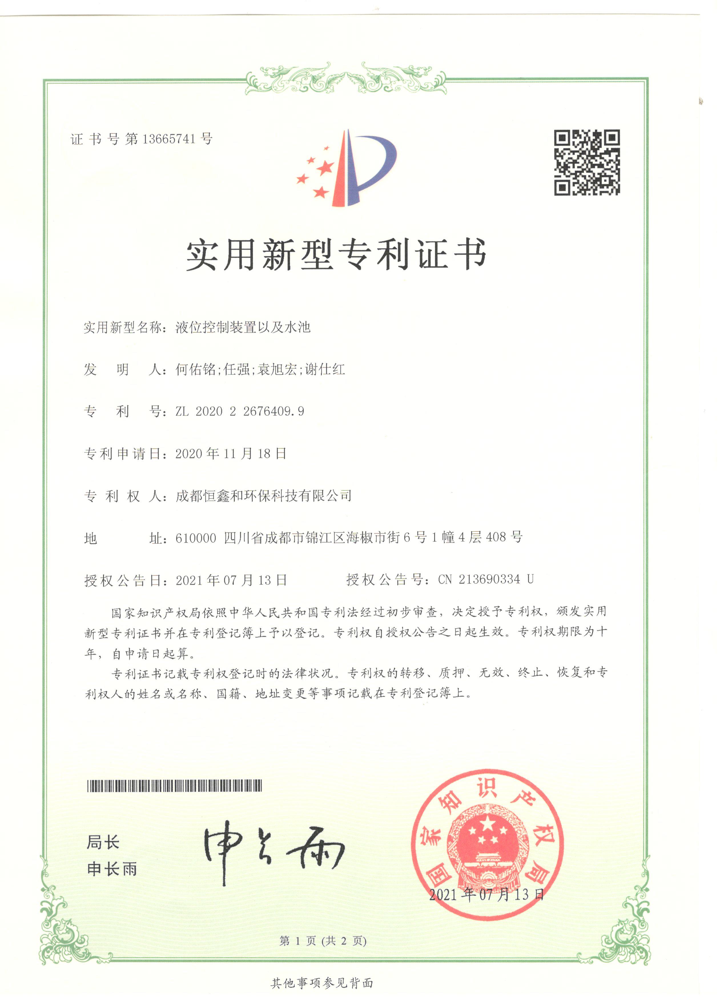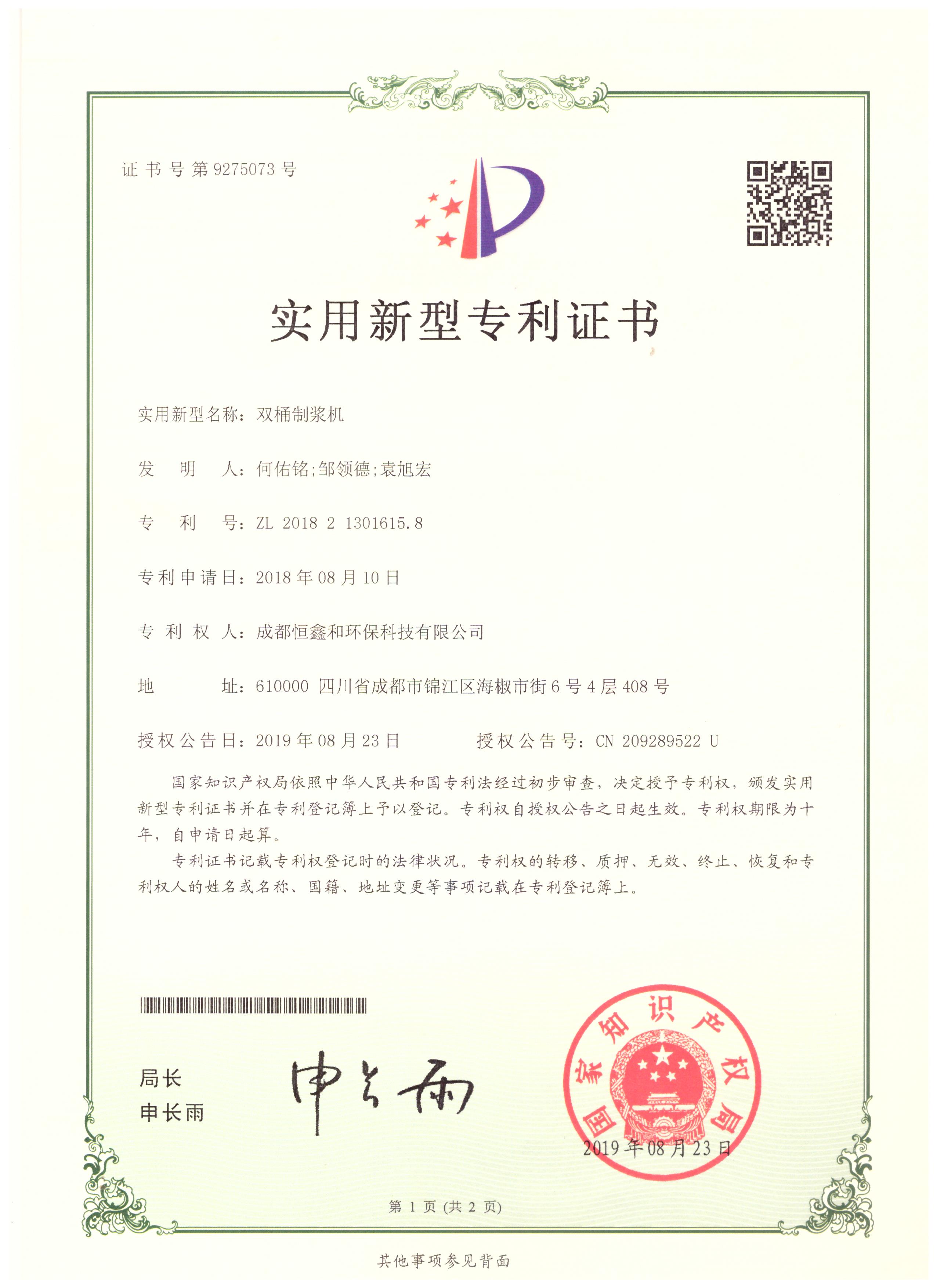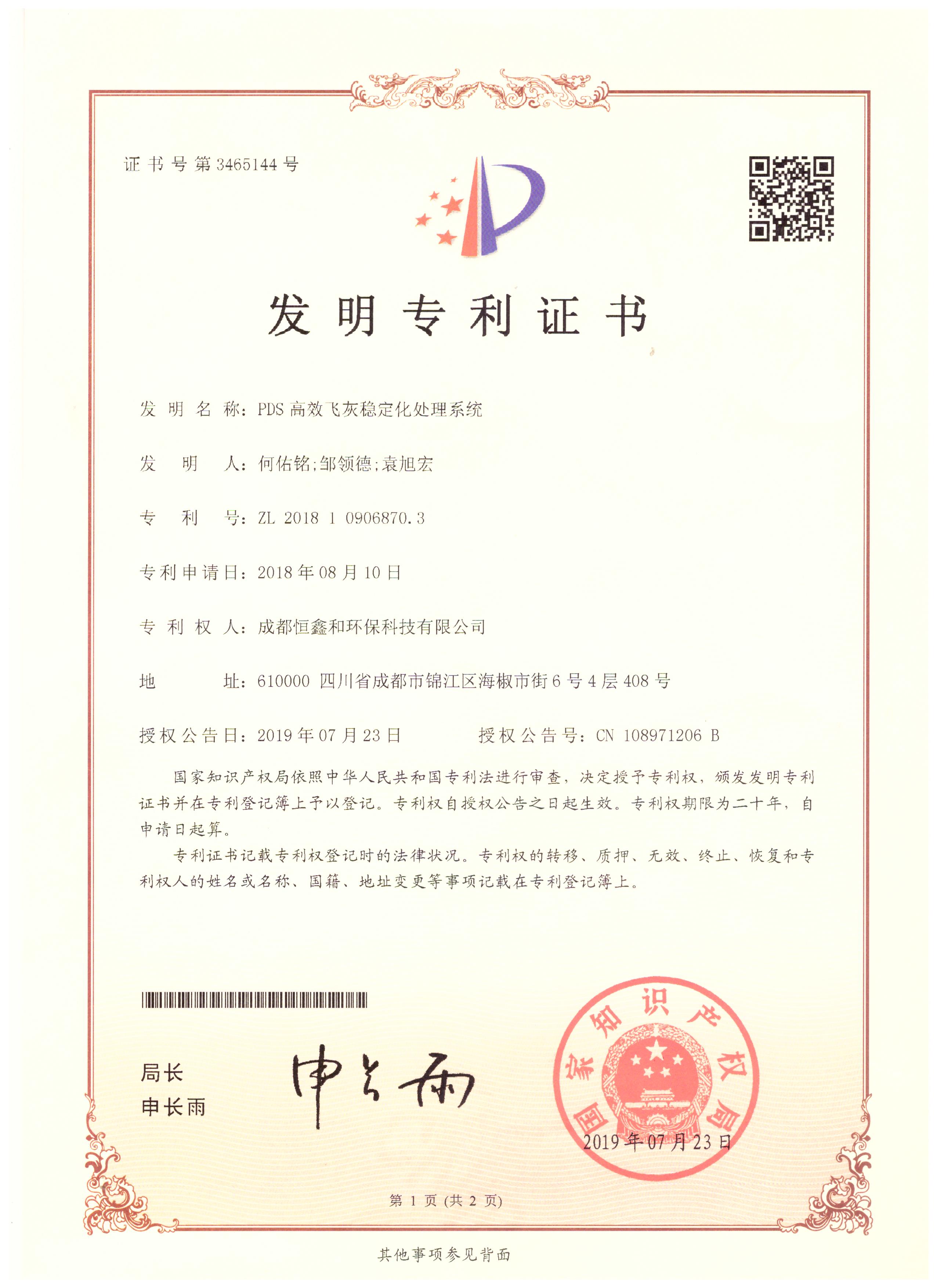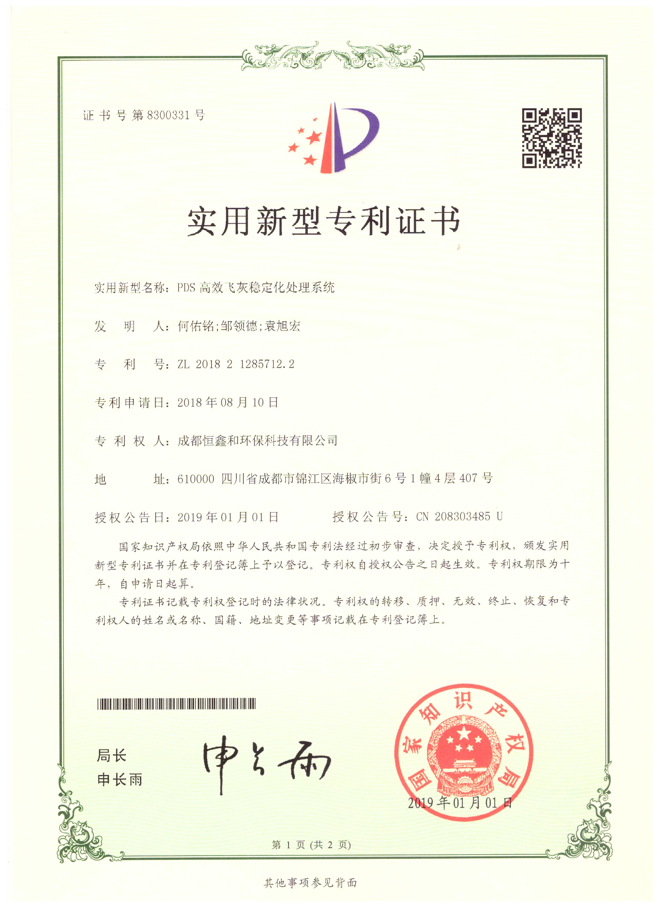 授權(quán)證書(分步式飛灰固化處理設(shè)備)